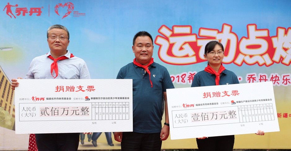 9月,,,向新疆自治区青基会、、、新疆兵团青基会共捐赠300万元,,,用于援建65所南疆地区学校的体育园地。。。